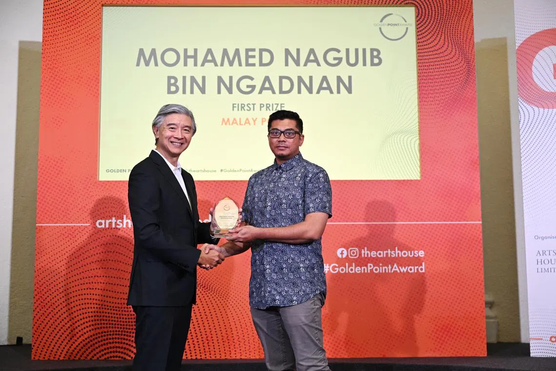 Pencipta karya dan guru sekolah menengah Bahasa Melayu, Naguib, 43 tahun, meraih tempat pertama dalam kategori puisi berjudul Butang, Velkro, Zip, Pin dan Tali Kasut.