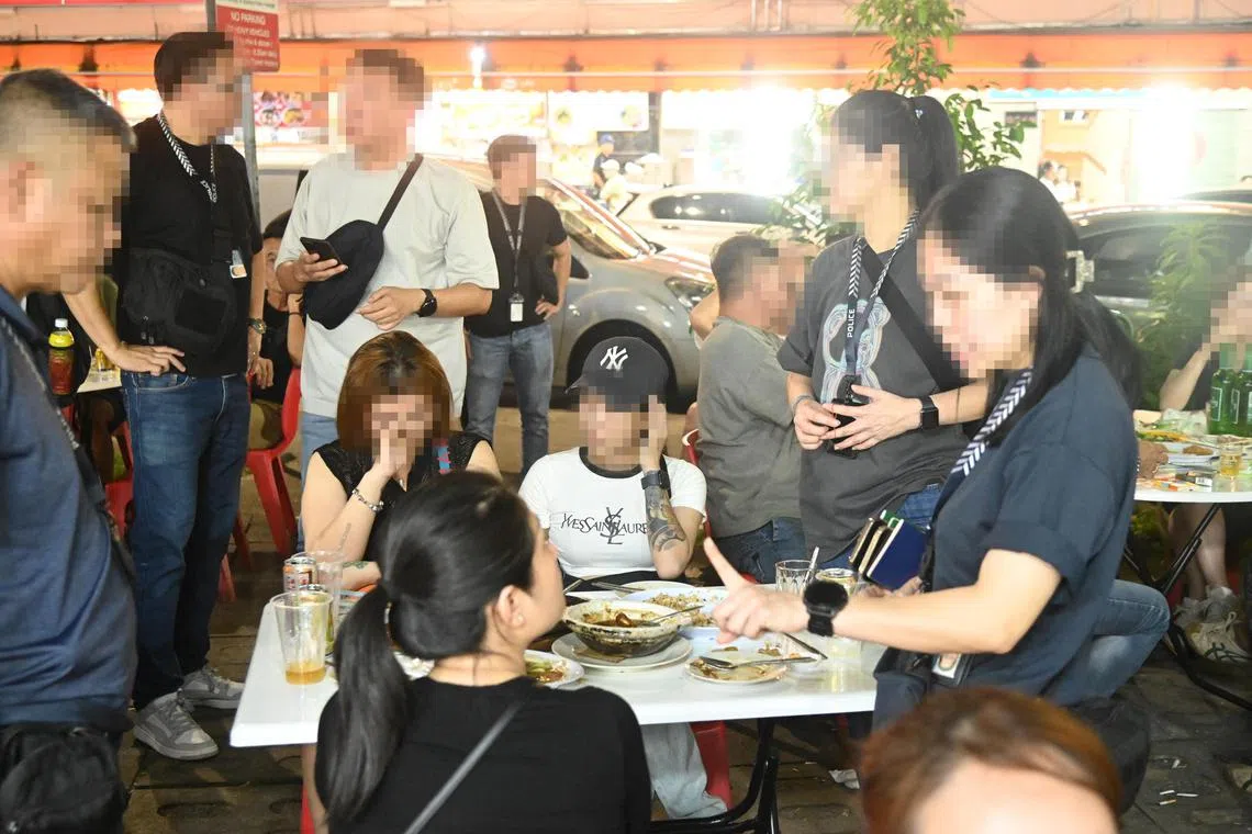 Mereka dan pengunjung lain yang sedang menikmati makan malam terkejut apabila premis itu diserbu pegawai daripada CID, Divisyen Polis Bedok, Penguasa Imigresen dan Pusat Pemeriksaan (ICA) dan Kementerian Tenaga Manusia (MOM).
