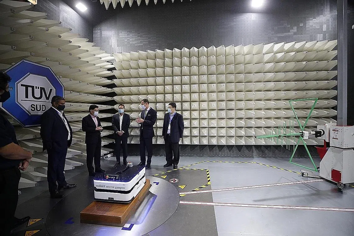 TINJAU KEMUDAHAN BARU: Timbalan Perdana Menteri Heng Swee Keat (tiga dari kiri) meninjau kemudahan di hab serantau baru syarikat Jerman TUV SUD di Jurong East semalam. - Foto BH oleh TIMOTHY DAVID