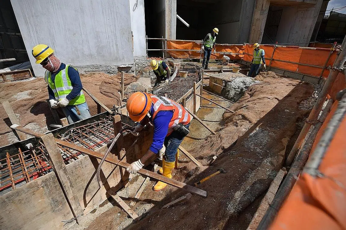 RANCAK SEMULA: Pekerja pembinaan memakai helmet dan jalur pergelangan tangan yang berwarna bagi mengenal pasti zon mana tempat tugasan mereka di tapak binaan BTO Senja Valley. - Foto BH oleh NG SOR LUAN -