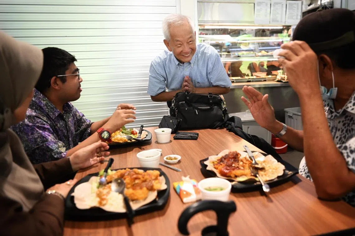 Encik Ng, 75 tahun, bertemu para penjaja dan pengunjung yang menjamu selera di pusat makan itu bersama tunangnya, Cik Sybil Lau.