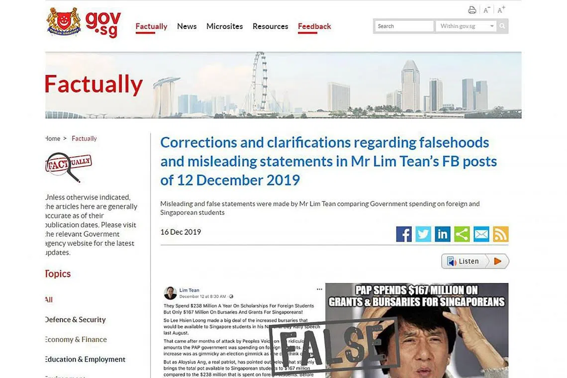 Laman pemerintah yang memeriksa fakta, Factually, semalam merujuk kepada dua kenyataan Encik Lim: "Jumlah yang tersedia untuk pelajar warga Singapura ialah $167 juta berbanding $238 juta yang dibelanjakan untuk pelajar asing" dan "PAP membelanjakan $167 juta dalam bentuk geran dan biasiswa bagi warga Singapura, tetapi (memperuntukkan) $238 juta untuk pelajar asing??"