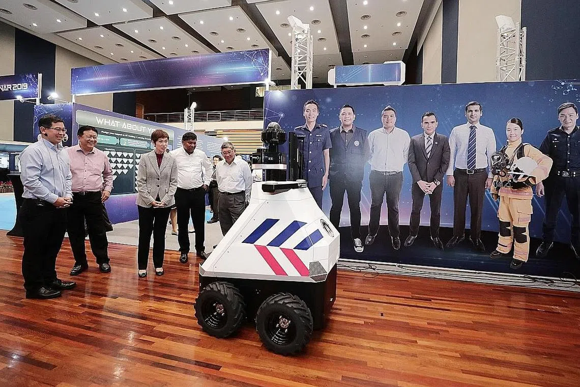 MANFAAT TEKNOLOGI: Teknologi dimanfaatkan dalam operasi polis dan Pasukan Pertahanan Awam Singapura (SCDF) untuk mempertingkat keupayaan dan ketangkasan operasi. Memberi contoh, Cik Teo berkata HTX bekerjasama dengan polis untuk membangunkan robot rondaan berautonomi dipanggil Robot Autonomi Semua Rupa Bumi Pelbagai Guna 3.0, atau M.A.T.A.R 3.0. - Foto fail -