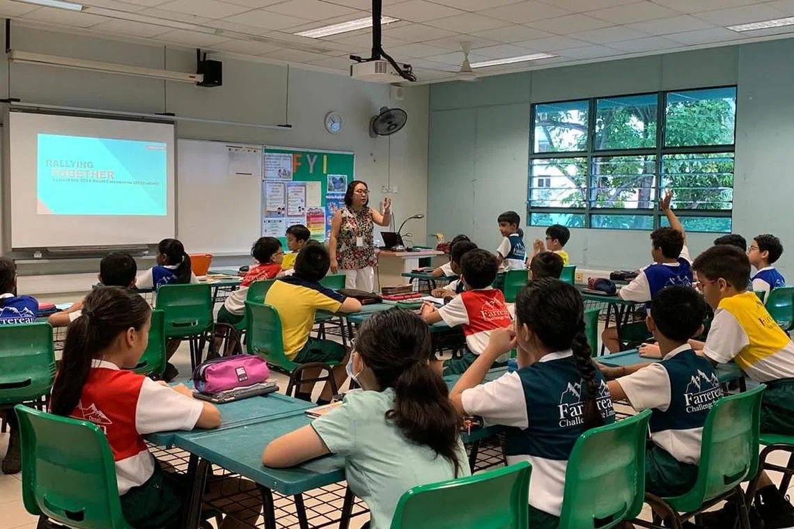 BERKUMPUL di bilik darjah masing-masing setibanya di sekolah, pelajar Sekolah Rendah Farrer Park mengambil suhu badan setelah selesai menyanyikan lagu kebangsaan dan melafazkan ikrar negara.