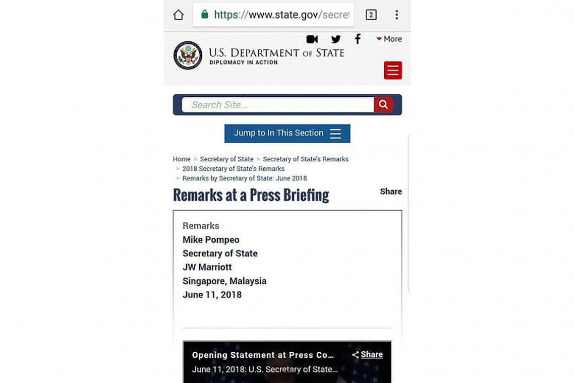 Dalam transkrip taklimat yang disampaikan Setiausaha Negara Amerika, Encik Mike Pompeo, kelmarin itu, ia menyatakan bahawa taklimat itu diadakan di "JW Marriott, Singapore, Malaysia".
