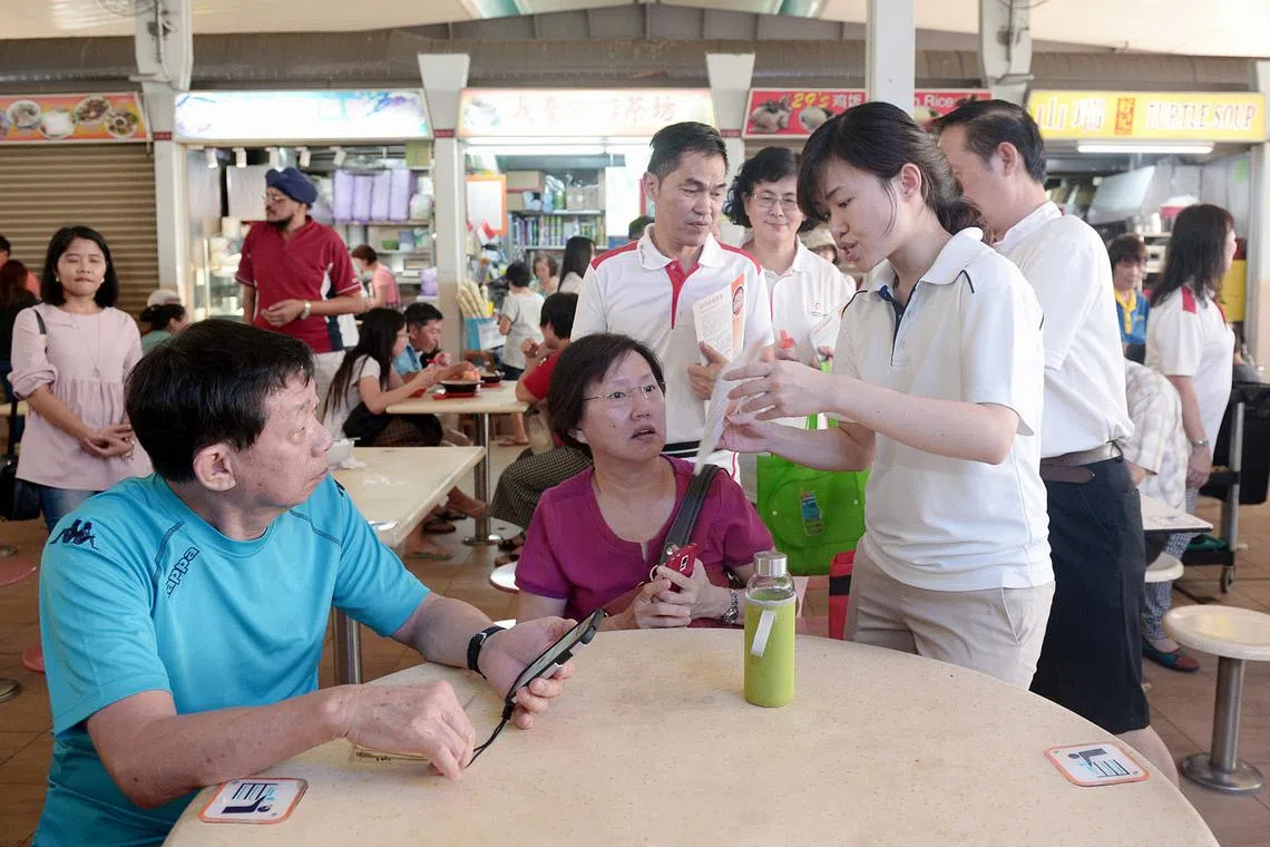 TEMUI PENDUDUK: Cik Tin Pei Ling (kanan) dan pemimpin akar umbinya meneruskan usaha mendekati penduduk di pasar berdekatan Aljunied Crescent untuk menerangkan tentang keadaan Zika dan menggesa mereka supaya mencegah pembiakan nyamuk Aedes yang boleh membawa virus itu dan denggi. - Foto THE STRAITS TIMES -