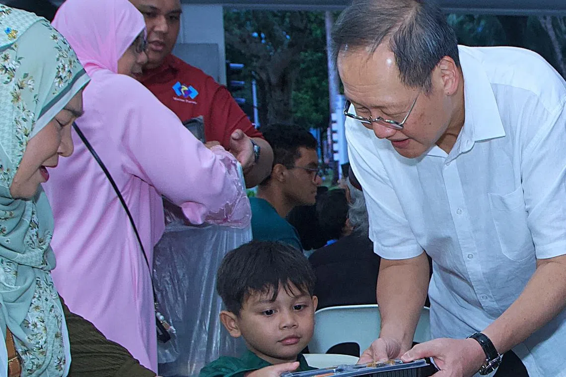 Menteri Tenaga Manusia, Dr Tan See Leng, yang juga Anggota Parlimen GRC Marine Parade, mengedarkan kotak bento kepada penduduk di acara berbuka puasa di Blok 44A Marine Crescent pada 8 Mac. - Foto FACEBOOK TAN SEE LENG