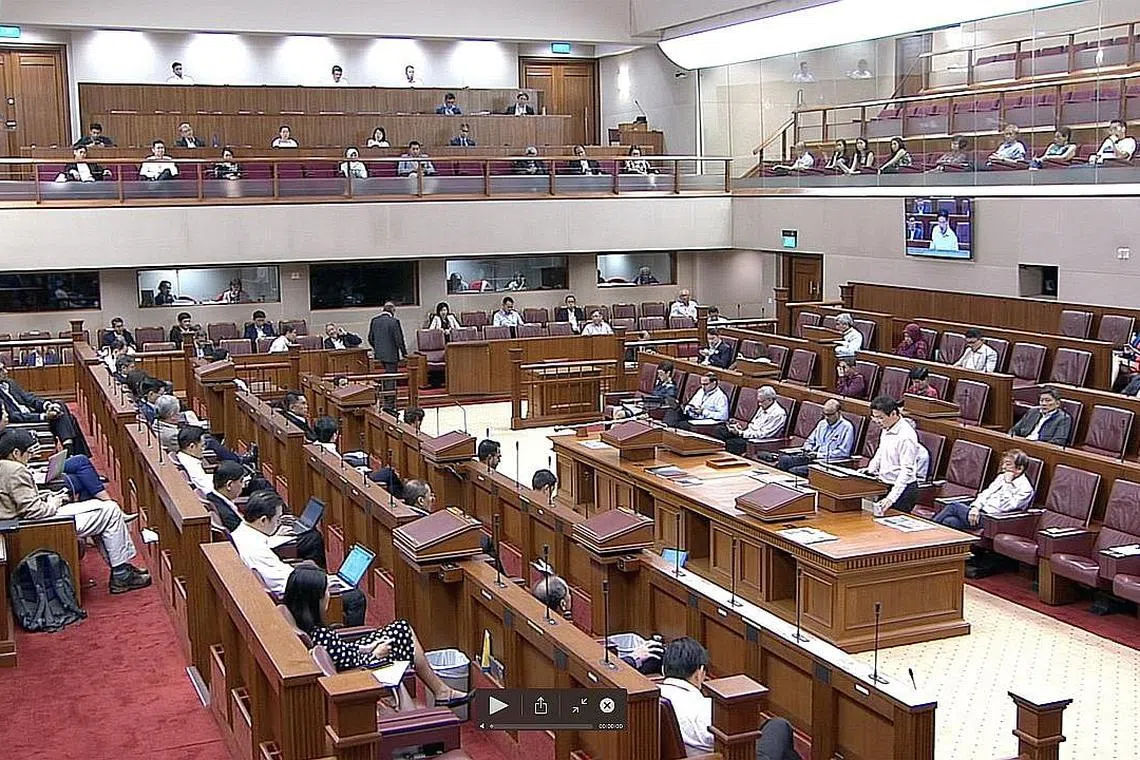 JARAK SELAMAT: Parlimen melaksana langkah jarak selamat mulai semalam, dengan setiap Anggota Parlimen perlu duduk berjauhan antara satu sama lain di dalam Dewan dan galeri dalam usaha mengurangkan risiko penularan Covid-19 - Foto GOV.SG -