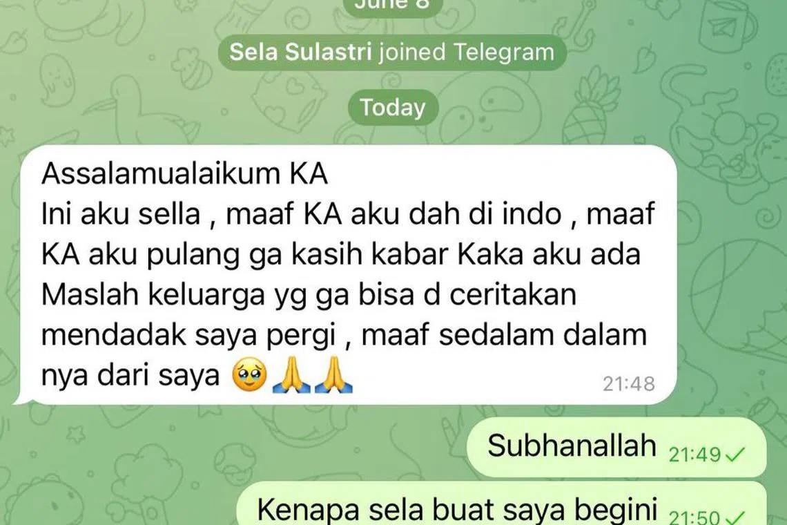 Gambar tangkap skrin telegram sebagai bukti Sella pembantu wartawan yang keempat, kabur pada hari cuti dan lari pulang ke Indonesia pada Jun tahun lepas. - Foto tangkap layar oleh RUBIAH MOHD