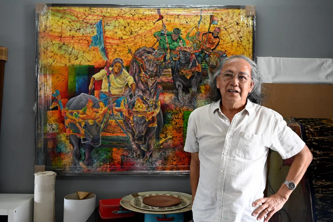 ‘RACE 2’: Sujak Rahman bergambar dengan lukisan batik bertajuk ‘Race 2’ sambil bercerita tentang pengalaman dan rancangan menghasilkan karya terbaru untuk pameran bersama M. Nasir dan S. Amin Shahab. - Foto oleh KHALID BABA