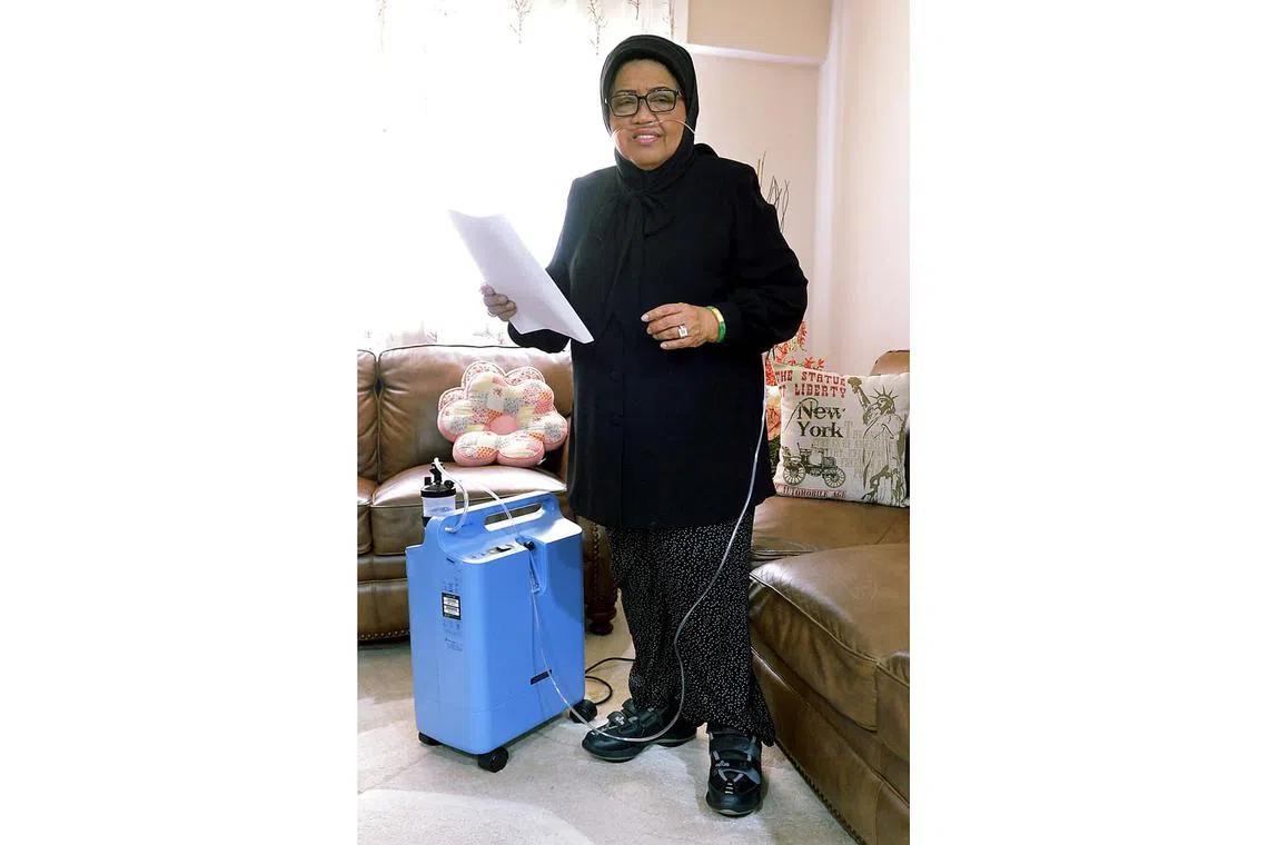 Sejak lapan bulan lalu Mami Asmah, yang mengalami fibrosis pulmonari iaitu kerosakan pada peparu yang menyebabkan masalah pernafasan yang serius, perlu mendapatkan bantuan oksigen tambahan daripada tangki oksigen mudah alih yang diletakkan di rumahnya.