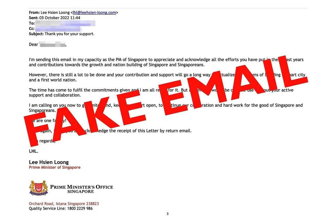 "Kandungan e-mel itu berbeza-beza - contoh di sini mengucapkan terima kasih kepada penerima atas sumbangan mereka kepada Singapura.