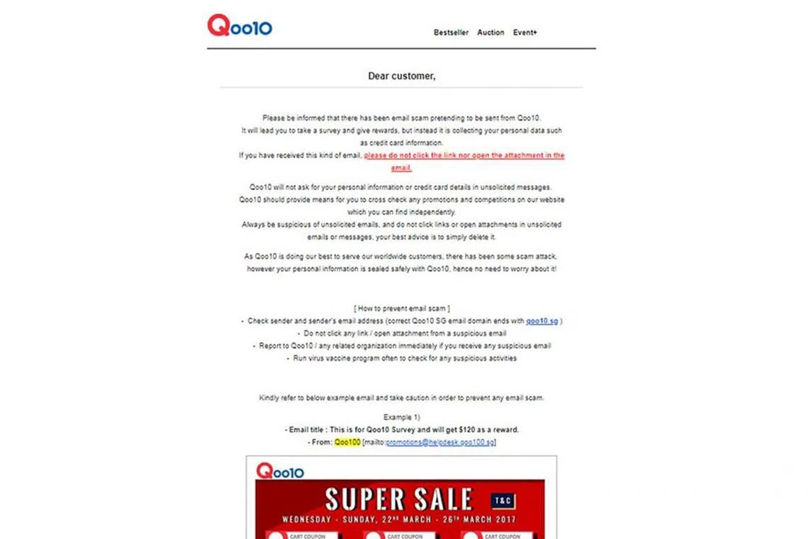 "Kami menasihatkan mereka supaya tidak klik pautan itu atau membuka dokumen dalam e-mel itu serta menjelaskan bahawa Qoo10 tidak akan meminta maklumat peribadi atau butiran kad kredit mereka," ujar jurucakap Qoo10.