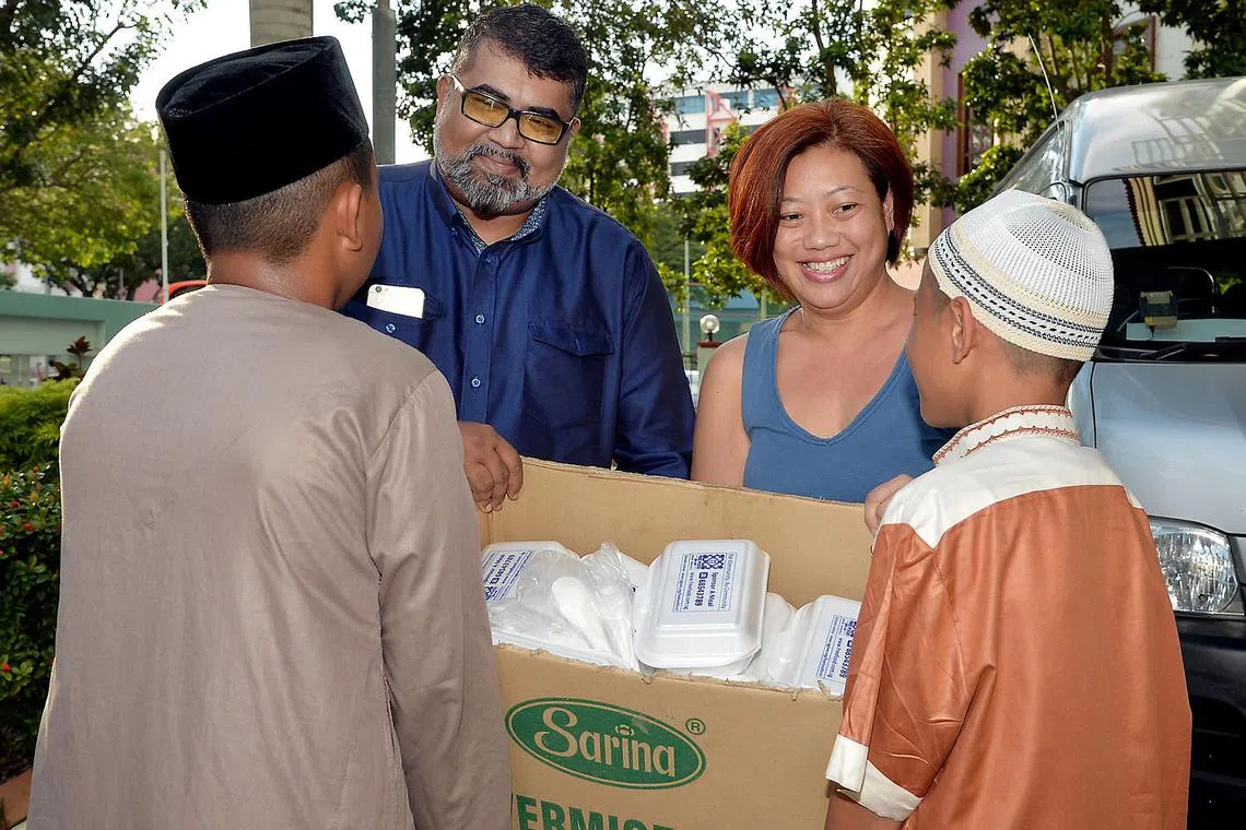 BAKTI TIDAK KIRA KAUM: Encik Nizar (dua dari kiri) bersama seorang sukarelawan FFFA, Cik Alyna Chong, mengagihkan makanan percuma di Darul Ihsan semalam. FFFA menganjurkan empat hingga lima pengagihan secara besar-besaran setiap tahun dan menyediakan 2,000 bungkusan setiap minggu. - Foto M.O. SALLEH -