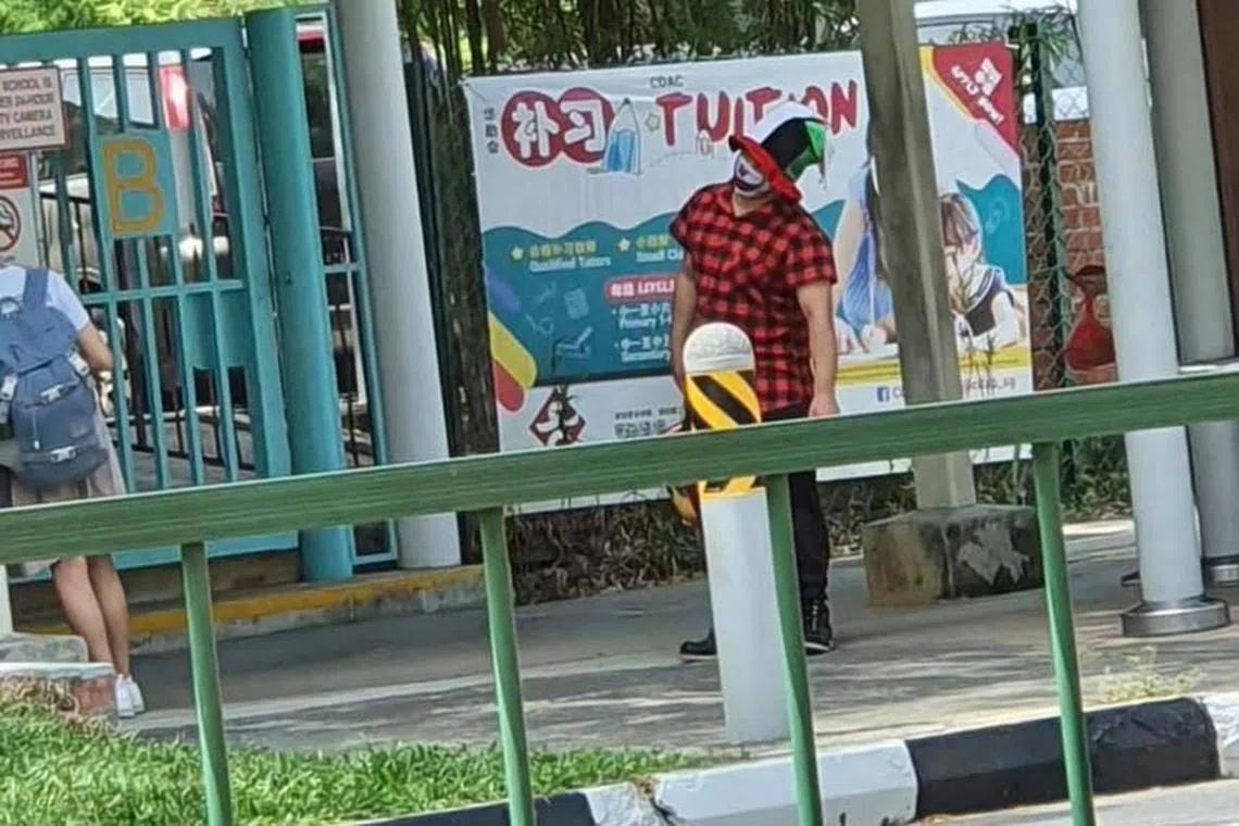 Salah seorang individu ini dikesan di luar Sekolah Tao Nan di Marine Parade, menggesa pengetua sekolah rendah itu agar menghantar surat pemberitahuan kepada ibu bapa agar menasihati anak-anak mereka agar tidak mengekori badut itu.