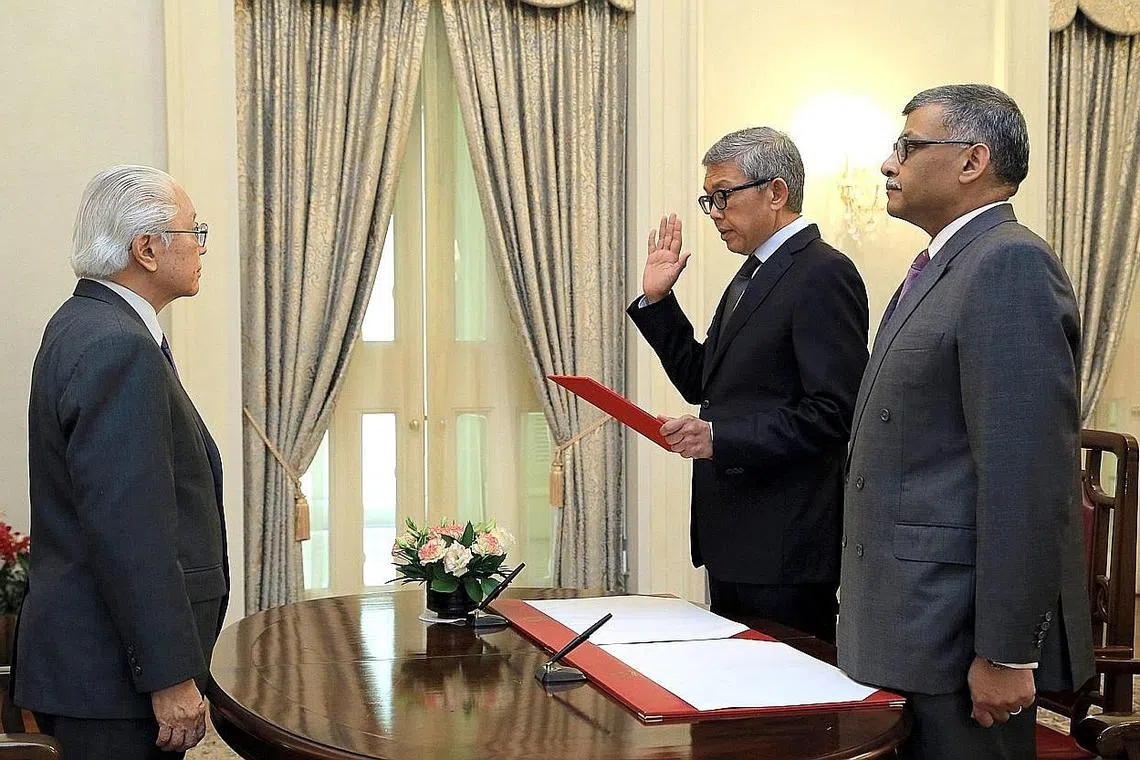 ANGKAT SUMPAH: Encik Bahren Shaari (tengah) mengangkat sumpah sebagai anggota pengganti Majlis Penasihat Presiden yang dirasmikan Presiden Tony Tan Keng Yam (kiri) dan dihadiri Hakim Besar Sundaresh Menon (kanan). - Foto KEMENTERIAN PERHUBUNGAN DAN PENERANGAN -