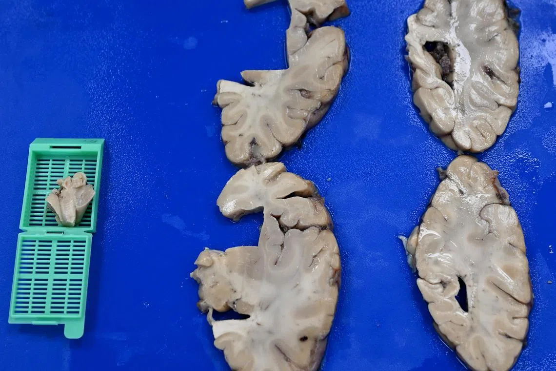 Apabila Bank Otak Singapura memperolehi otak, ia akan dibelah dua – satu bahagian dipotong menjadi blok-blok kecil dan dibekukan, dan lagi separuh diproses dalam bahan kimia formalin untuk elak pereputan. Bahagian yang diproses dalam formalin itu kemudian akan dikeluarkan untuk dipotong. Bahagian otak yang penting seperti hipokampus yang penting bagi pembelajaran dan memori (bahagian kecil dalam potongan otak dalam katrij hijau dalam gambar) akan dikenal pasti. Ia kemudian akan dipotong menjadi kepingan tipis bagi analisis histologi dan molekul supaya dapat melihat struktur sel, protein dan penanda penyakit di bawah mikroskop. - Foto BH oleh KHALID BABA