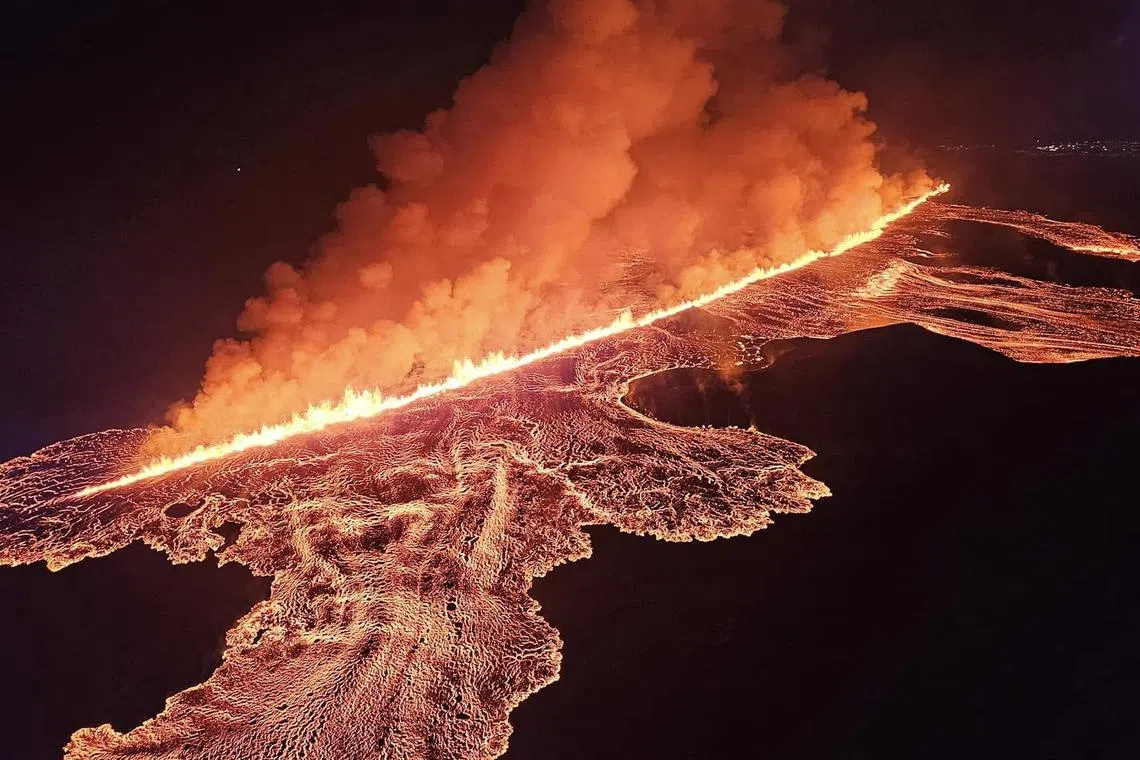 Foto dari Jabatan Pertahanan Awam Polis Negara di Iceland diambil pada waktu malam 22-23 Ogos 2024 yang menunjukkan lahar dan asap dari gunung berapi berhampiran Grindavik di semenanjung Iceland Reykjanes. - Foto AFP, JABATAN PERTAHANAN AWAM POLIS NEGARA ICELAND