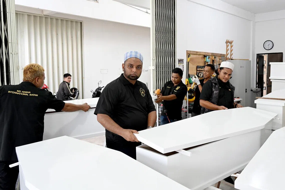 Syarikat Md Akbar International Batam membantu menguruskan jenazah, termasuk mandi dan kapan bagi orang Islam, dan kemudian menghantar jenazah kembali ke Singapura melalui bot laju.