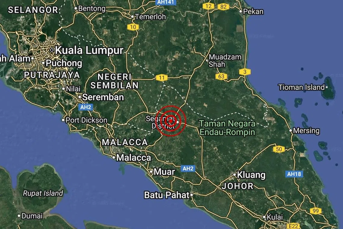 Pusat gempa terletak di 2.5 darjah utara dan 102.8 darjah timur pada kedalaman 10 kilometer, 5 kilometer ke barat Segamat, Johor.
