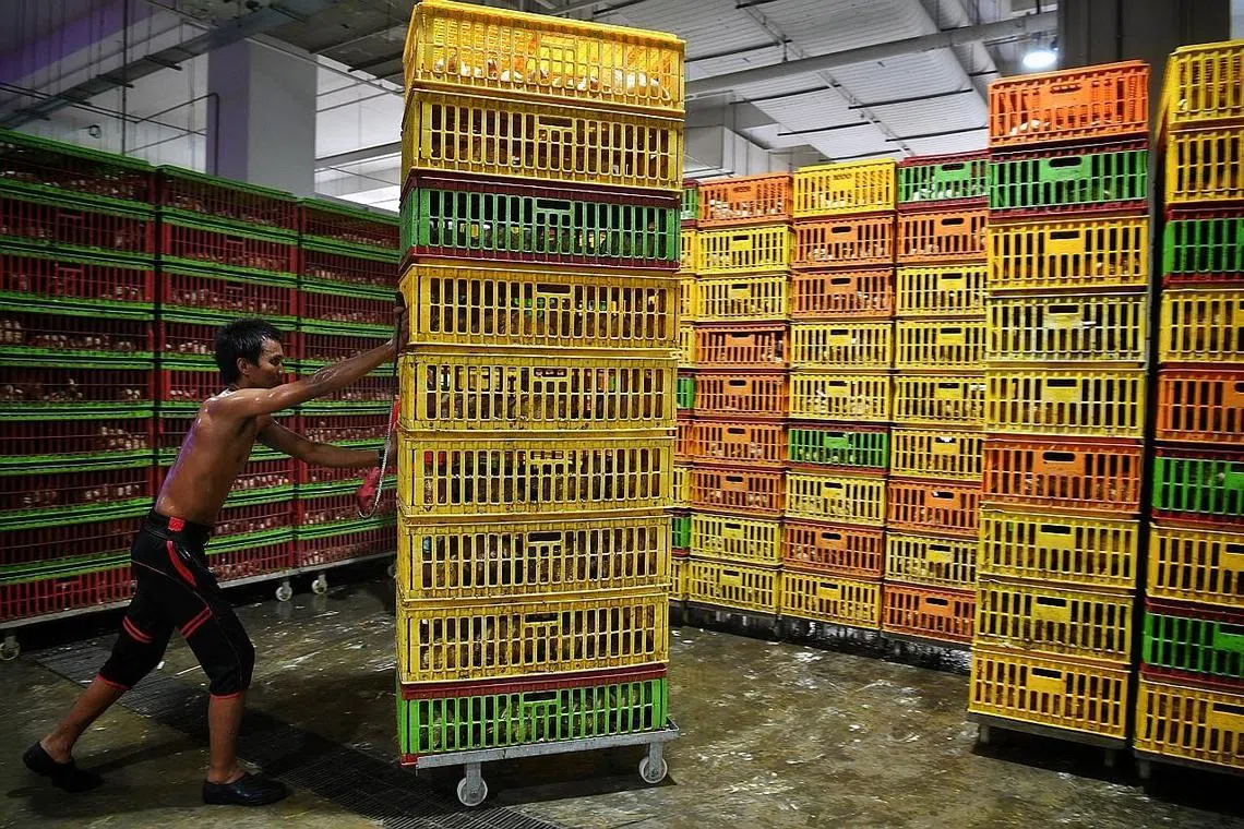 Seorang pekerja di Hab Pemprosesan Ayam Itik JTC menolak kotak-kotak mengandungi ayam hidup yang baru dibawa turun dari lori Malaysia semalam.