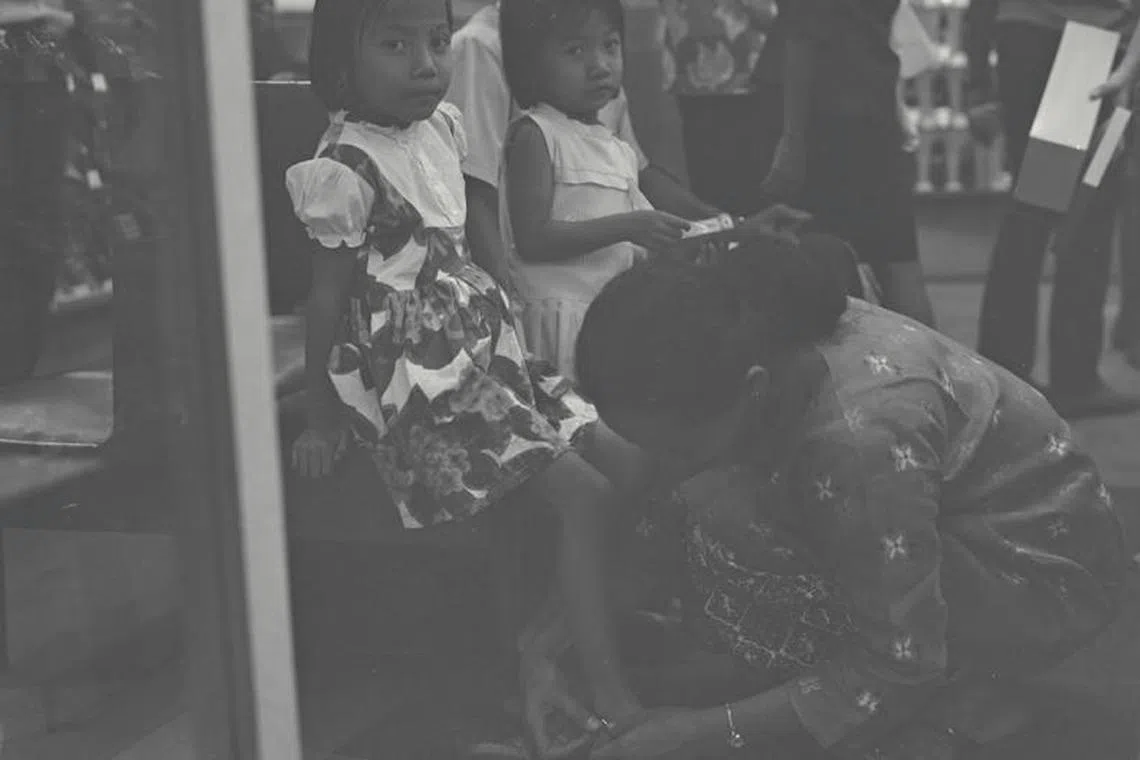 Seorang ibu menyarungkan kasut ke kaki anaknya dalam gambar yang dirakam pada 6 Janari 1967 ini. Membeli pakaian dan kasut baru antara kegiatan yang dilakukan oleh masyarakat Melayu/Islam di sini.