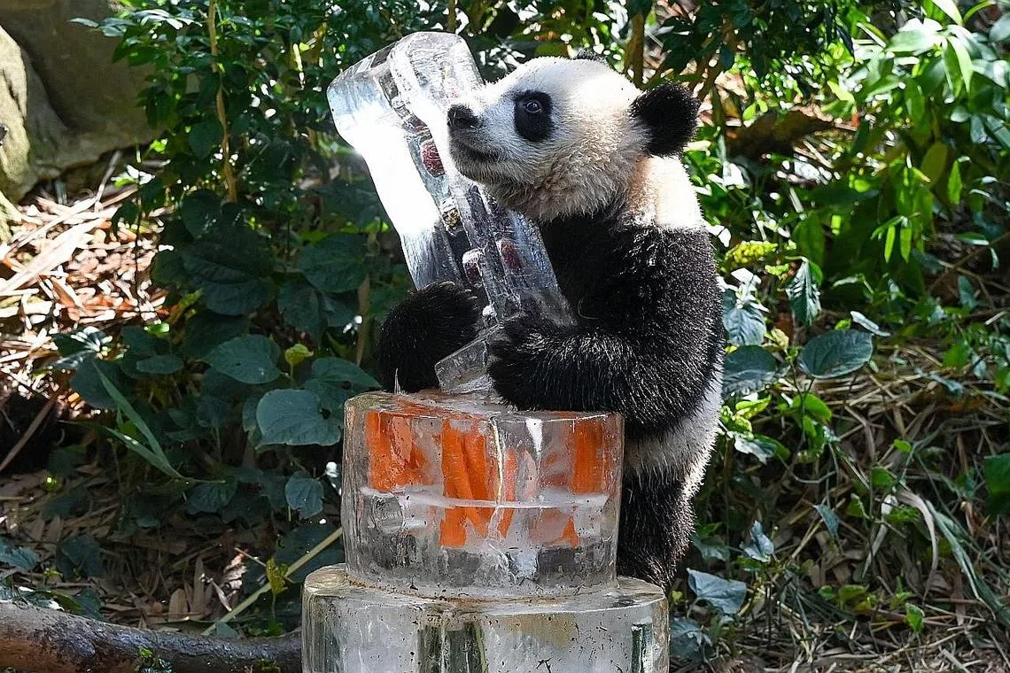 LE LE, anak beruang panda pertama yang dilahirkan di Singapura menyambut hari lahirnya yang pertama ditemani ibu Jia Jia.