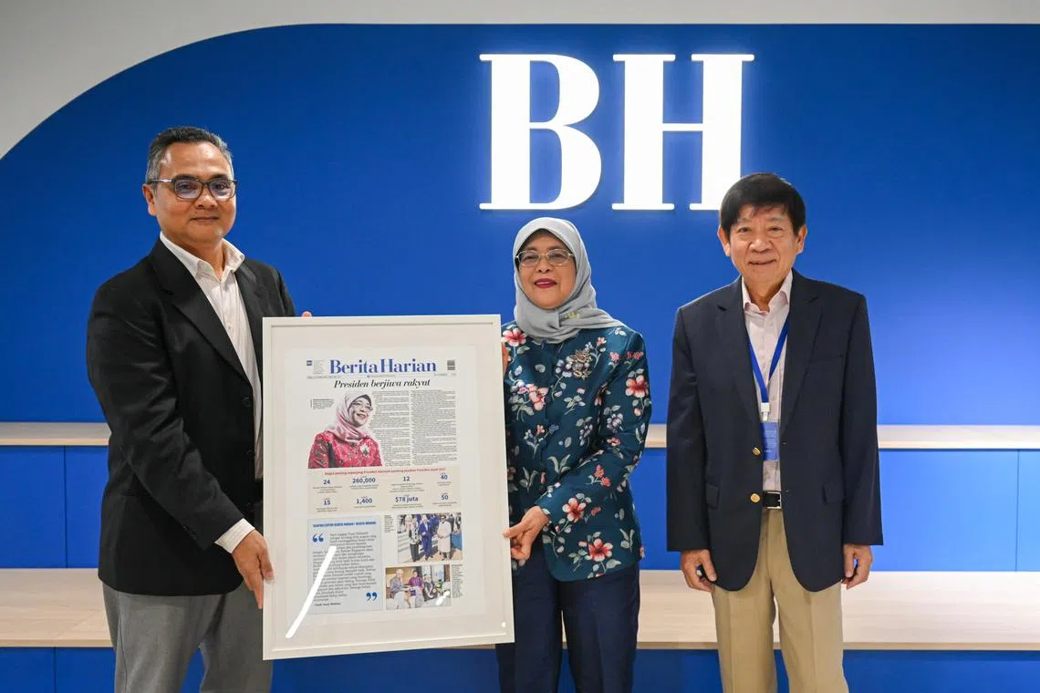 SUMBANGAN DISANJUNG: Editor BH, Encik Nazry Mokhtar (kiri), dan Pengerusi SPH Media Trust, Encik Khaw Boon Wan, menyampaikan cenderamata kepada mantan Presiden Singapura, Puan Halimah Yacob. - Foto BH oleh SHAFIQ APANDI