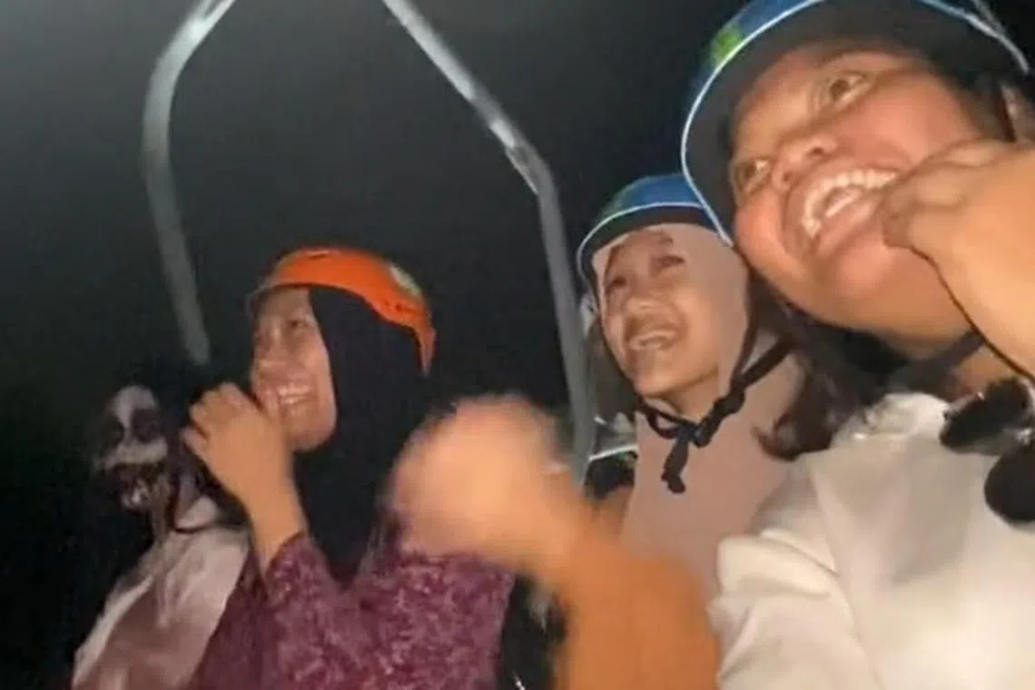 Baru sahaja Cik Ain ingin berjinak-jinak dengan suasana seram, beliau dan saudara-maranya perlu berkongsi tempat duduk dengan ‘kak Pon’ untuk menaiki kerusi layang (chairlift) ke atas bukit.