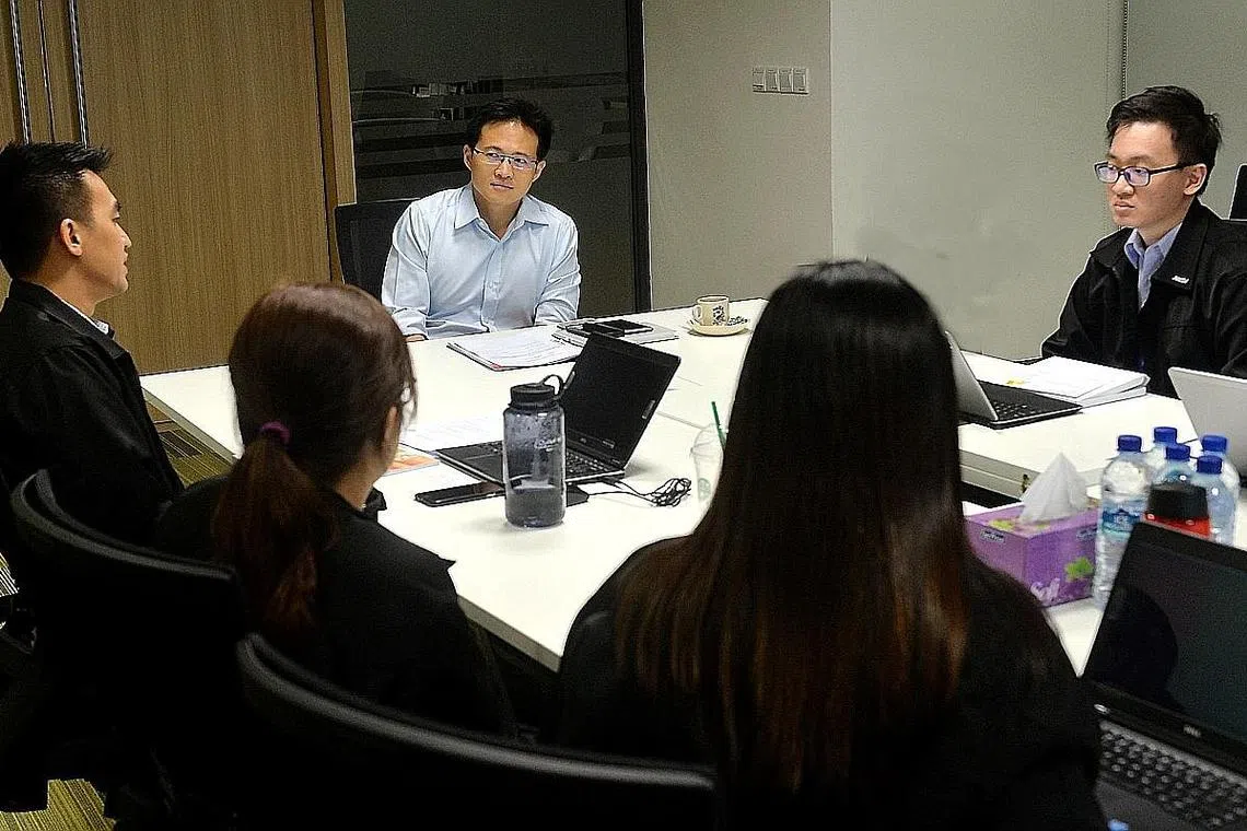 MANFAATKAN KEKUATAN CDC: Encik Desmond Choo (berbaju biru) bermesyuarat bersama pegawai CDC North East. Kekuatan CDC menyatukan orang ramai dan pelbagai pertubuhan harus dimanfaatkan, kata beliau. - Foto KHALID BABA -