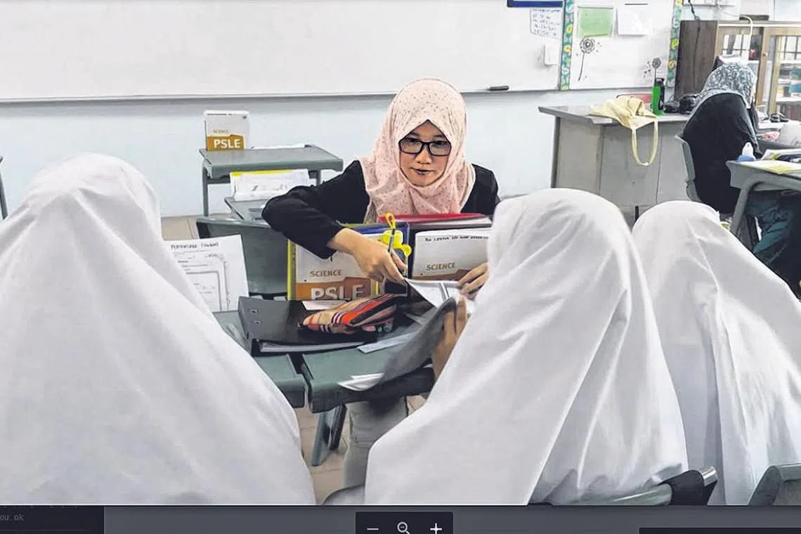 BERJINAK-JINAK MENGAJAR: Cik Insyirah (menghadap kamera) menyemai minat dalam mengajar sejak kecil lagi. Dengan menyertai program AAM di Madrasah Alsagoff, beliau berpeluang mengalami kehidupan sebagai seorang guru dan menggilap kemahiran dan nilai dalam bidang pengajaran. -