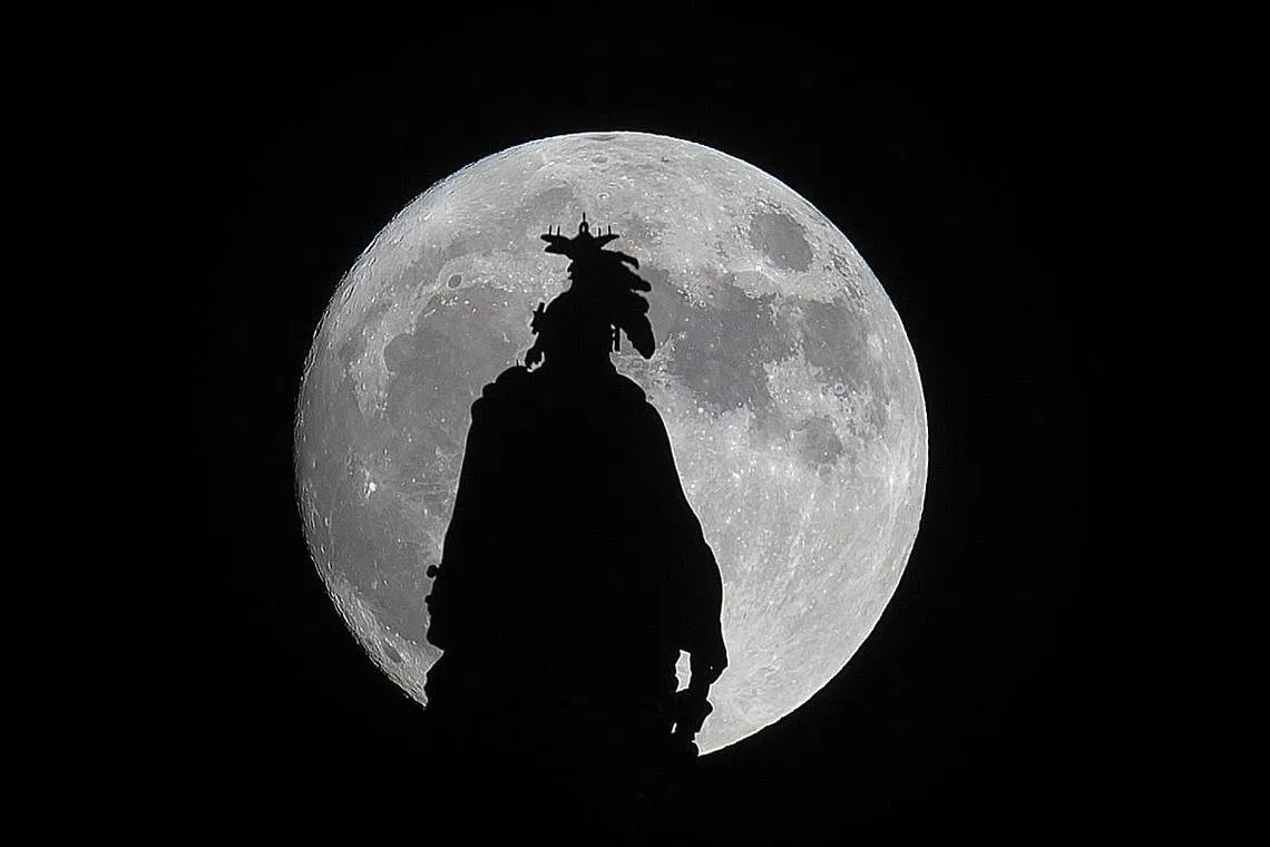 BULAN PALING BESAR: 'Supermoon' yang dilihat di sebalik Statue of Freedom di Capital Dome di Washington, DC, pada malam Ahad lalu. Bulan penuh itu berada di jarak paling dekat dengan bumi sejak 68 tahun lalu malam tadi dengan hanya sekitar 356,500 kilometer antara bulan dengan bumi. - Foto AFP -