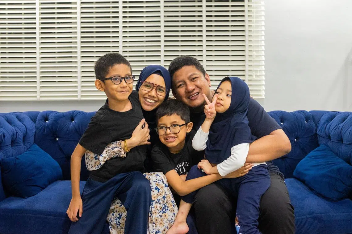 Cik Siti Nabilah Mohd Ridzwan (dua dari kiri) mengemudi segala cabaran bersama suaminya, Encik Muhammad Rasidi Hassan, untuk membesarkan anak-anak mereka, Muhammad Mikail Muhammad Rasidi (tengah), Muhammad Adam Muhammad Rasidi (kiri), yang mempunyai autisme, serta Jannah Aafiyah Muhammad Rasidi (di peha bapanya). - Foto BM oleh IZWANDI AZMAN