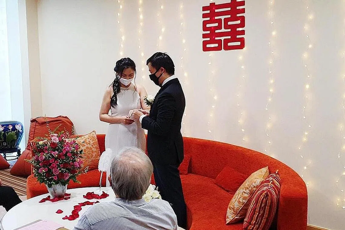 Ini dilakukan pasangan Kang Gui Ling, 30 tahun, dan Gerard Ong Zhenyi, 31 tahun, yang mengadakan majlis perkahwinan mereka di Kelab Masyarakat Woodlands Galaxy baru-baru ini.