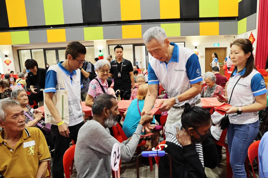 Sempena perayaan itu, Perdana Menteri, Encik Lee Hsien Loong, (gambar atas) telah mengagihkan paket merah yang mengandungi wang tunai dan baucar pasar raya kepada mereka di satu majlis jamuan sarapan di Kelab Masyarakat Teck Ghee pada 28 Januari.