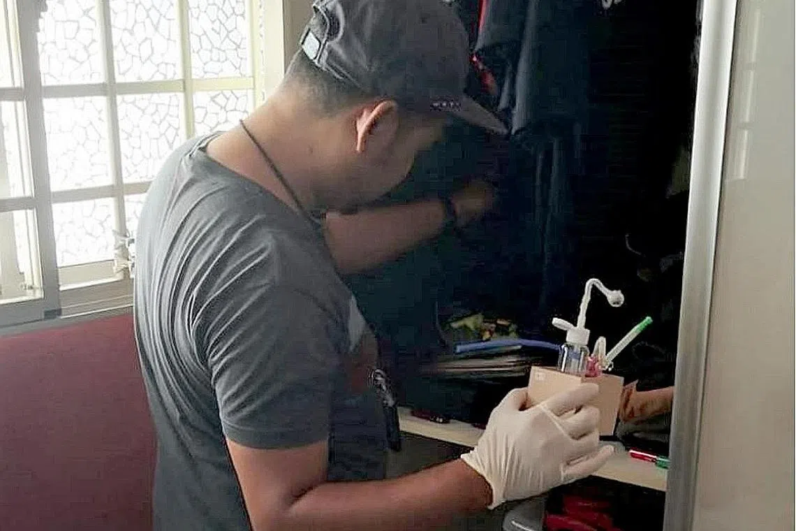 OPERASI MENYELURUH: Seorang pegawai CNB memeriksa sebuah unit semasa operasi serata Singapura dijalankan CNB dari pagi Isnin lalu hinggga semalam. - Foto CNB -