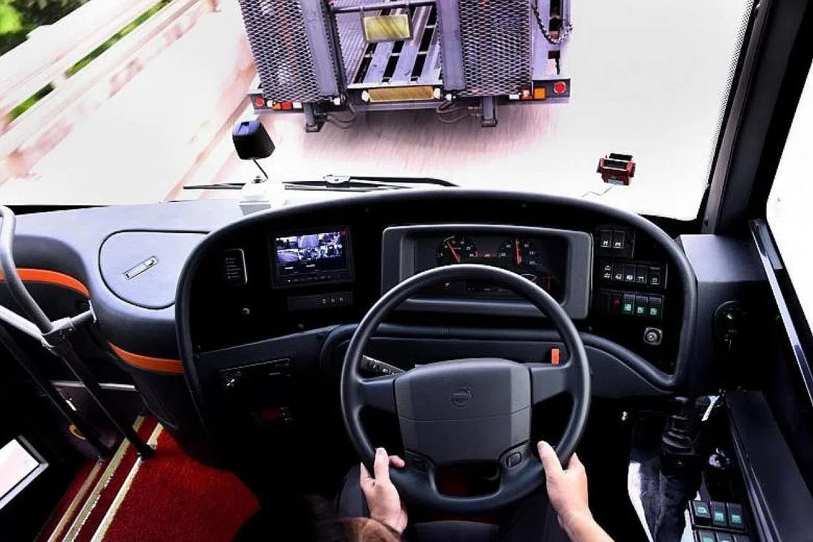 CIRI-CIRI AMARAN: Syarikat ComfortDelGro telah membeli empat bas Volvo lengkap dengan ciri-ciri amaran langgar dan brek kecemasan automatik. - Foto ZAOBAO -