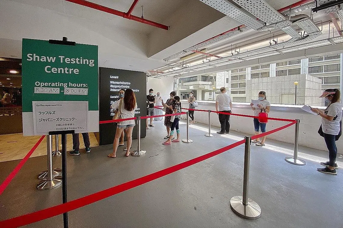 Orang ramai beratur panjang di luar dan dalam Shaw Centre, menanti giliran menjalani ujian di Pusat Perubatan Raffles mulai 8.30 pagi, lapor The Straits Times. Kebanyakan berkata mereka mahu memastikan mereka selamat.