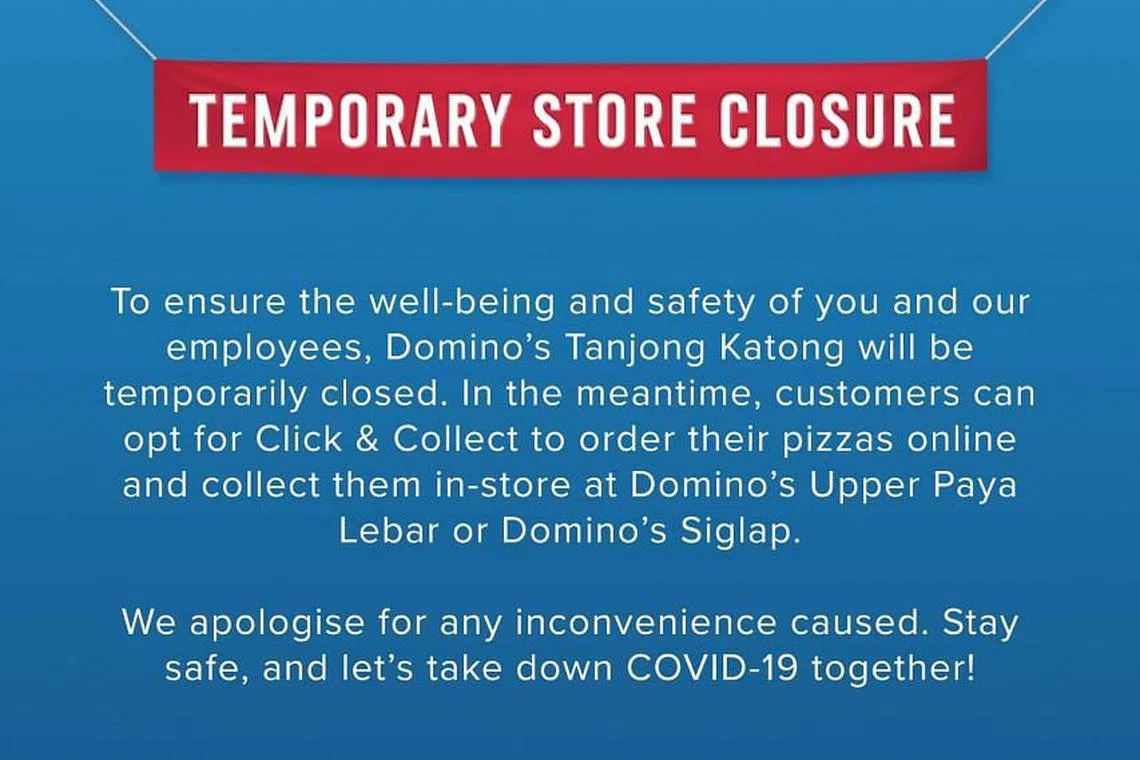 Sementara itu, di laman Facebook Domino's Pizza Singapore, dimaklumkan cawangan Tanjong Katong ditutup buat sementara waktu demi kesejahteraan dan keselamatan pelanggan dan pekerjanya.