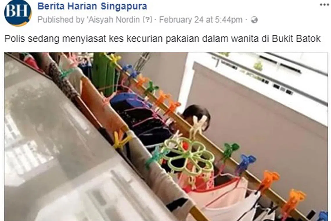 Laporan mengenai kes kecurian pakaian dalam wanita di Bukit Batok membuat ramai berasa marah, namun ia juga mencuit hati. Pos tersebut, yang menjangkau lebih 5,000 pengguna di Facebook Berita Harian, melaporkan tentang kes di mana seorang lelaki didakwa mencuri pakaian dalam wanita yang sedang dijemur di luar koridor rumahnya di Bukit Batok.