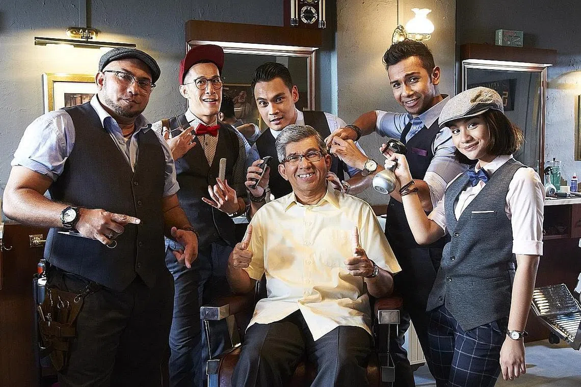 MENGHIBUR SAMBIL SAMPAIKAN PESAN: Dr Yaacob Ibrahim (duduk), yang berlakon sebagai dirinya sendiri dalam telemovie Gunting, menyifatkan wadah penceritaan ini sebagai berkesan dalam menjelaskan daya usaha dan dasar pemerintah, seperti SMEs Go Digital. Bersamanya ialah pelakon (dari kiri) Najib Soiman, Shane Mardjuki, Hisyam Hamid, Taufik Batisah dan Yuslina Yussof. - Foto TRIBAL WORLDWIDE -