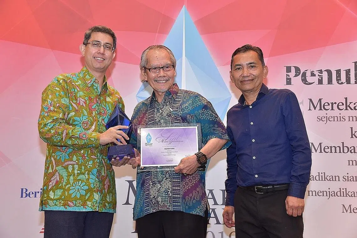 TERIMA HADIAH: Encik Adam Fadila (tengah) meraih wang tunai $5,000 dan piala yang disampaikan oleh Dr Muhammad Faishal Ibrahim. Kanan ialah Editor Berita Harian/Minggu, Encik Saat A. Rahman. - Foto BH oleh IQBAL FAIZAL -