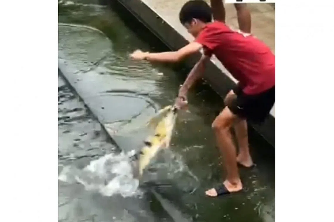 Dalam video itu, seorang anak muda berkemeja-T dilihat berada di anak tangga, menggapai tangannya ke dalam air di kawasan ikon Merlion sebelum menarik keluar seekor ikan berwarna kuning.