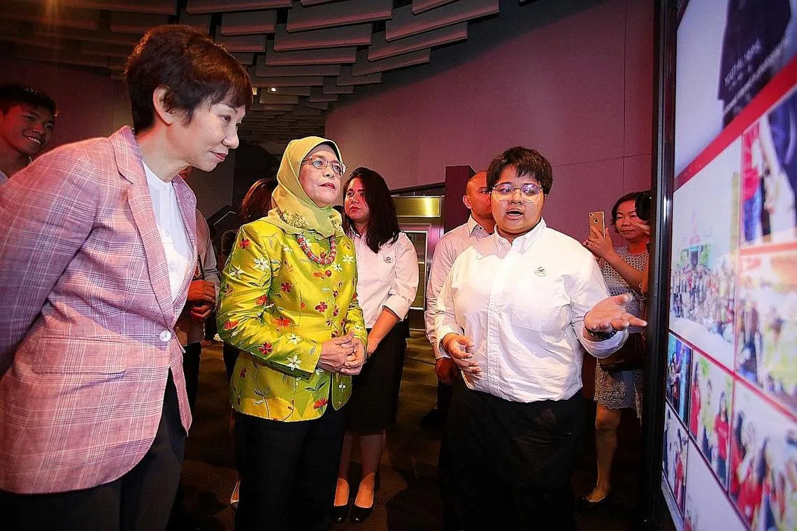 PROJEK MASYARAKAT: Cik Huril (kanan) menerangkan tentang projek masyarakatnya di bawah program kepimpinan Kor Belia Singapura (YCS) kepada Presiden Halimah Yacob dan Menteri Kebudayaan, Masyarakat dan Belia, Cik Grace Fu, di sebuah majlis menandakan tamat program itu baru-baru ini. - Foto NYC -
