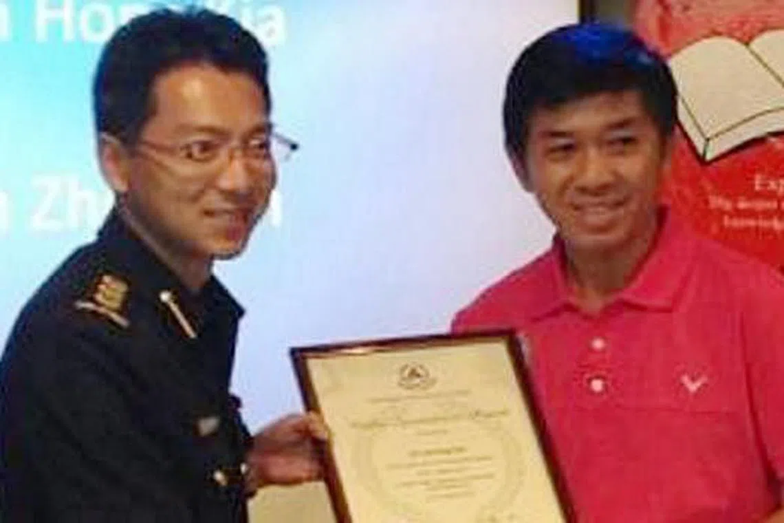 SEMANGAT AWAM: Encik Lim dan Encik Yan (kanan) diiktiraf SCDF kerana membantu menyelamatkan dua mangsa kemalangan yang terperangkap dalam sebuah kereta yang terbakar di BKE Jumaat lalu. -
