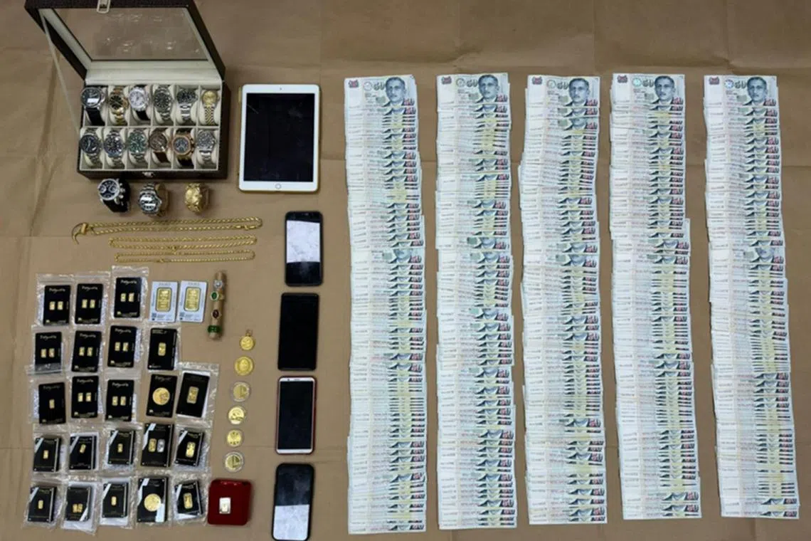 Pelbagai barang dirampas, termasuk wang tunai berjumlah lebih $25,000, 15 jam tangan mewah, serta emas dalam bentuk kepingan, syiling, cincin dan loket.