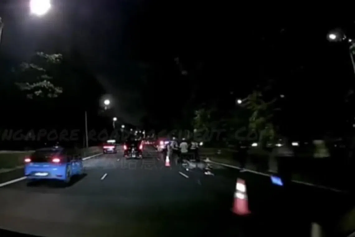 Rakaman video yang dimuat naik di kumpulan Facebook Singapore roads accident.com menunjukkan sebuah motosikal remuk di jalan raya, dengan khemah biru dan beberapa serpihan kelihatan berhampiran.