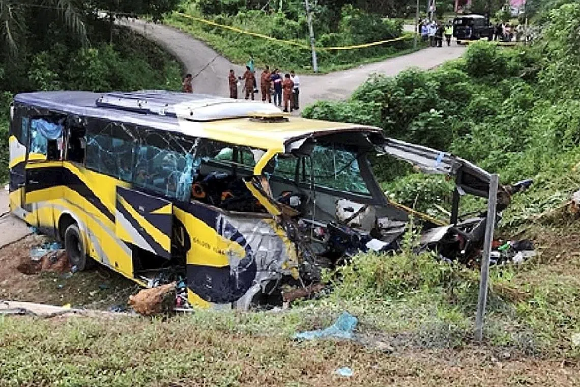 KEMALANGAN RAGUT NYAWA: Seramai 14 orang terkorban apabila bas ekspres yang dinaiki mereka dalam perjalanan ke Kuala Lumpur dari Johor Bahru terjunam ke dalam cerun dekat Muar, Johor, awal pagi semalam. - Foto BERITA HARIAN MALAYSIA -