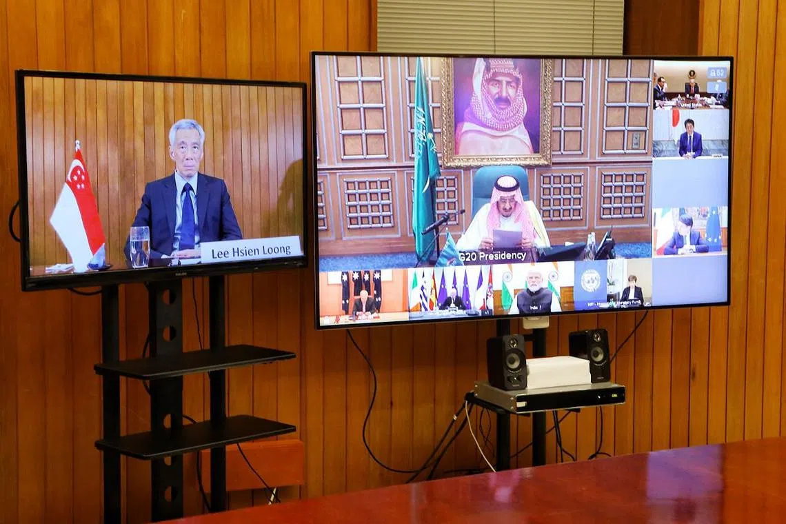 Dalam kenyataan bertulisnya bagi Sidang Puncak Maya Pemimpin G20 pada Khamis (26 Mac), Encik Lee menyarankan kerjasama dalam bidang kesihatan awam, kemerosotan ekonomi serta sains dan kajian. Beliau berkata walaupun setiap negara mampu menghapuskan koronavirus itu dalam sempadan masing-masing, risiko mengimport kes dari negara lain tetap wujud. Oleh itu, beliau mengajak negara-negara bekerjasama, mengongsi kepakaran dan pengalaman, dan bantu satu sama lain. Mengenai kemerosotan ekonomi, Encik Lee berkata ekonomi global sedang runtuh dan setiap pemerintah sedang melakukan yang termampu untuk menyelamatkan perniagaan dan pekerjaan. "Pada saat ini, adalah penting pasaran kewangan tidak berhenti berfungsi. Saya gembira Menteri Kewangan kita dan Gabenor Bank Pusat menyelaraskan dasar kewangan dan fiskal untuk mengelakkan ini (daripada berlaku)," tulisnya. Berkaitan sains dan kajian, Encik Lee berkata negara-negara perlu menyatukan sumber dan masyarakat saintifik untuk membangunkan ubat atau vaksin bagi Covid-19. "Pandemik ini adalah bukti kesalingbergantungan kita, bukan penunjuk keburukan globalisasi. Ia menekankan perlunya kerjasama yang lebih banyak antara negara, bukan yang berkurang. Sebagai pemimpin, kita mesti bekerjasama selepas krisis ini untuk membangunkan semula keyakinan domestik dalam merit dunia yang global," tulisnya.