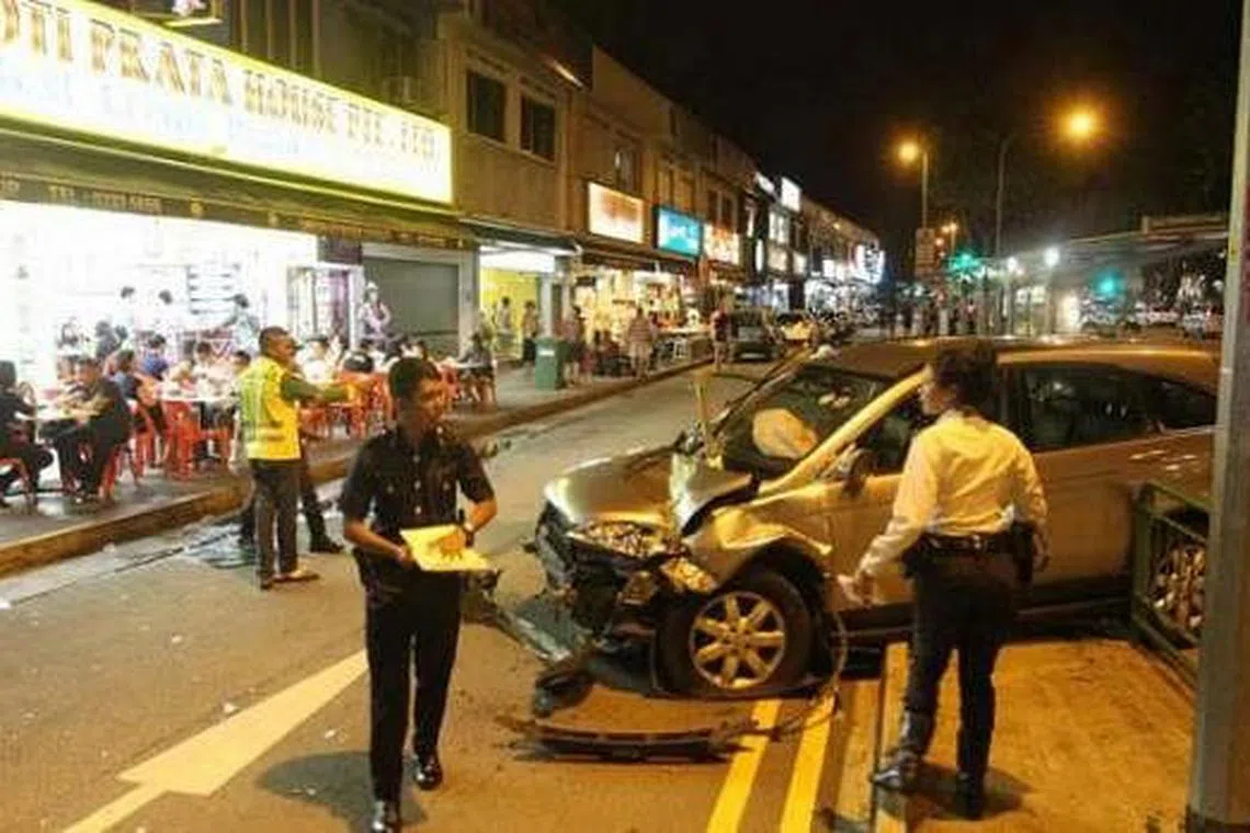 SEBUAH kereta merempuh pagar berhampiran kedai The Roti Prata House di Upper Thomson Road kira-kira 6.15 malam kelmarin.